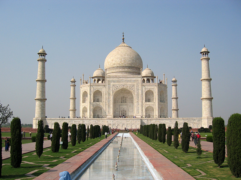 The Taj Mahal was built by Shah Jahan for his wife. Later, Shah Jahan was also buried there by his son. To the left of the main building is a mosque. On the right is an empty building that is a mirror image of the mosque. The right building is just there for symmetry.