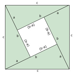 When I was young, I read a book where a character, Elmer Dimsdale, sang a song that said that the square of a hypotenuse of a triangle equals the sum of the square of the other two sides — and that there are over a thousand ways to prove it. I have no idea what are the thousand ways to prove the familiar Pythagorean Theorem (a2 + b2 = c2), but here is one that is pretty straightforward.