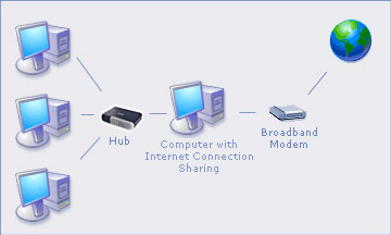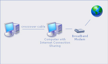 In this option, we avoid the purchase of an Internet router. A computer running Windows 2000, Windows XP or Linux can easily play the same role. Microsoft calls the feature Internet Connection Sharing (ICS). To set up this option, the computer running ICS needs two network cards. One will connect to the modem. The other will be connected to a hub, which is used by all the computers sharing the connection. ICS is enabled for the connection to the cable modem, and the additional computers will all automatically configure themselves to use the ICS computer as the Internet router. If we are sharing the connection with only one other computer, we do not need the hub. Instead, we can connect the two computers directly with a special network cable called a crossover cable.