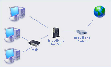 This option is easy to install and pretty inexpensive — usually around $50 for the router and necessary network cables. The option tends to be relatively secure due to the fact that all of these routers provide NAT and almost all have built-in firewalls. The purpose and technology behind NAT and firewalls will be explained in detail in the future on this site, but in short, both technologies make it harder for hackers to get at machines inside our Local Area Network (LAN). This option is somewhat constrained in the number of computers that can be attached at one time, because of the limited number of network ports on the router (typically 4 or 8); however, it is possible to accommodate additional computers by using an inexpensive hub (about $20):