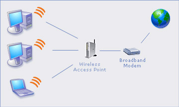In the first two options, all of the computers had to be close enough to the modem for a network cable to reach. Network cables can be long (about 25 meters) and they can be placed inside walls, but there is a big advantage to setting up a wireless network instead. Computers can be placed anywhere in the house and one can pick up and move a laptop at any time. Many PDAs can also use a wireless network connection.